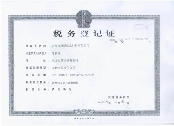 歡迎來(lái)到鞏義市新躍供水材料有限公司官方網(wǎng)站!您現(xiàn)在訪問(wèn)的是:《稅務(wù)登記證》頁(yè)面,如需幫助請(qǐng)致電:13140066578 或 0371-64100988